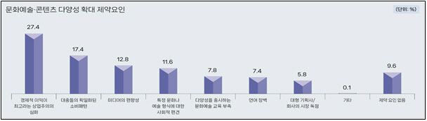 미디어를 통한 콘텐츠 이용의 다양성 제약 요인으로는 주류문화에 집중된 미디어 콘텐츠 생산(22.2%), 대형 미디어의 시장 장악(18.0%), 특정 문화에 대한 고정관념이나 편견이 반영된 콘텐츠 생산(13.0%), 알고리즘 기반의 편향적 콘텐츠 소비(11.2%) 등이었다.