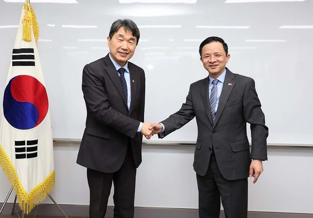 이주호(왼쪽) 사회부총리 겸 교육부 장관이 27일 서울 종로구 정부서울청사에서 다이빙 주한 중국대사와 면담 기념 악수를 하고 있다. / 교육부 제공