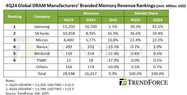 삼성전자는 지난해 4분기 D램 사업에서 112억5000만달러(약 16조2000억원)의 매출을 기록하며 전 분기(107억달러) 대비 5.1% 증가했다. 시장 점유율은 41.1%에서 39.3%로 소폭 하락했다.