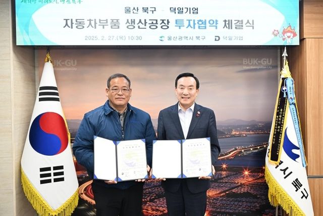 [파이낸셜경제=김예빈 기자] 울산 북구는 27일 북구청장실에서 자동차 부품업체인 덕일기업과 투자협약을 체결했다.