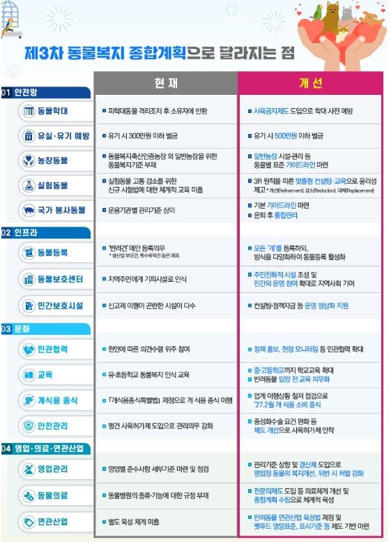 [와이뉴스] 농림축산식품부는 '제3차 동물복지 종합계획(2025~2029)'을 발표하여 향후 5년간 동물복지 정책의 비전과 방향을 제시했다.