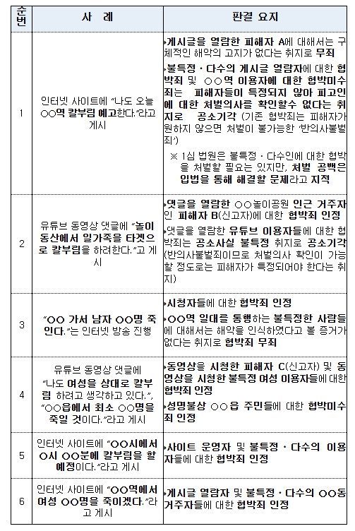 특히, 불특정・다수에 대한 공중협박 행위를 기존의 협박죄로 처벌할 수 있는지 피해자를 누구로 보아야 하는지 언제 범죄가 성립 하는지 등에 대해 판결이 엇갈리고, 처벌하지 못한 사례도 있었다.