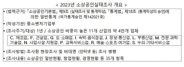 [와이뉴스] 중소벤처기업부와 소상공인시장진흥공단(이사장 박성효)은 27일 '2023년 소상공인실태조사'의 잠정결과를 발표했다. 소상공인실태조사는 소상공인·자영업자 지원정책 수립을 위한 기초자료로 활용되며, 매년 시행되고 있다.