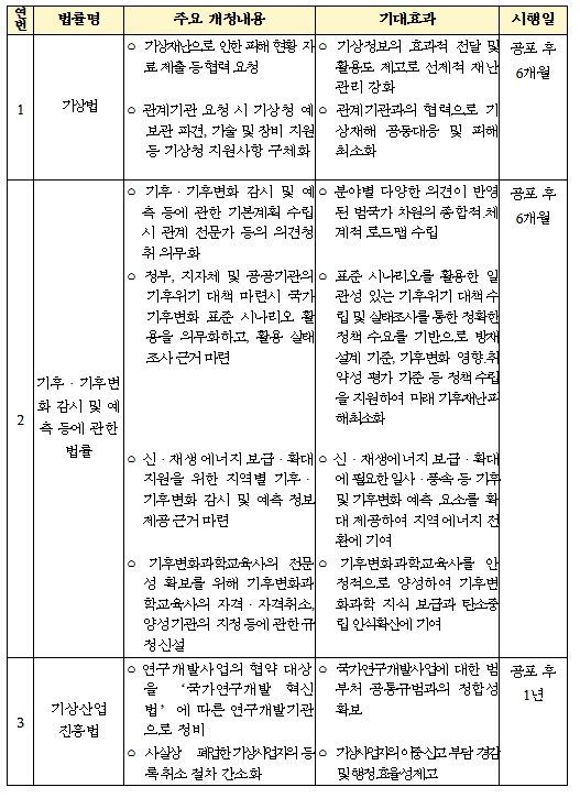 먼저, ‘기상법’은 기상청장이 관계 기관에 기상현상으로 인한 재난 피해 현황 등 관련 자료를 요청할 수 있도록 하여 위험기상 예상 시 사전 정보를 적시에 필요한 곳에 제공하고, 관계 기관 요청 시 기상청의 인력ㆍ장비 등을 지원하는 근거를 마련하도록 개정됐다. 이를 통해 위험기상으로부터 국민을 보호할 국가 차원의 재난 대응 체계를 보다 강화할 수 있게 됐다.