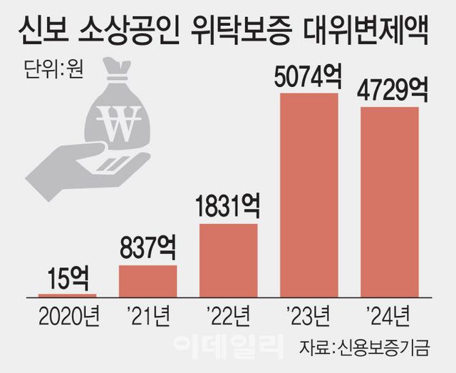 2020년 15억원에 그쳤던 대위변제액은 2021년 837억원, 2022년 1831억원, 2023년 5074억원으로 늘었다. 소상공인 위탁보증은 정부가 코로나19로 자금난을 겪는 자영업자·소상공인을 지원하기 위해 2020년 5월부터 2022년 1월까지 한시적으로 운영한 사업이다. 은행이 보증심사를 진행하고 신보가 보증을 서 소상공인이 최대 4000만원까지 대출받았다. 당시 신속한 지원이 중요하다는 점에서 보증과 대출 절차를 간소화했다.