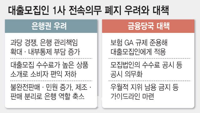 은행권은 전속의무제 폐지 이후 나타날 부작용을 우려한다. GA 불완전판매 책임 소재 논란, 과당경쟁에 따른 시장 혼탁, 수수료 비용의 소비자 전가 등 보험업계와 같은 문제가 은행에서 불거질 수 있다는 것이다. 현재 5대 시중은행(KB국민·신한·하나·우리·NH농협)에 등록된 대출모집인은 약 2700~3000명, 대출모집법인은 약 400개다. 1사 전속의무가 풀려 대출모집인이 여러 은행의 대출 상품을 추천·중개하면 대출모집인 시장이 폭발적으로 커질 수 있다. 실제 보헙업계에서는 GA 소속 설계사가 매년 2만명 가량 늘어 현재 29만명에 달한다.