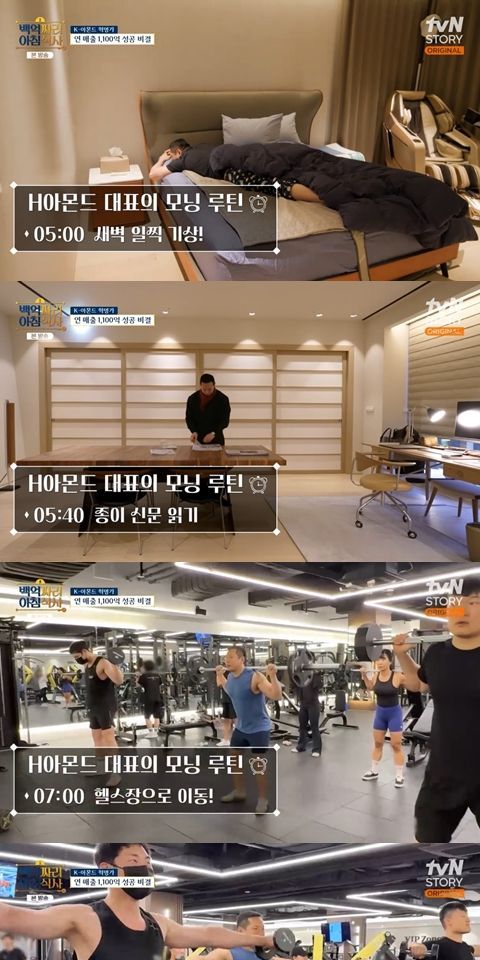 그리고 옷만 갈아입고 출근, 보통 오전 5시 30분~6시 사이에 도착해 종이 신문을 읽는다고. 이어 그는 "회사 근처 헬스장으로 7시까지 간다"면서, 직원들과 함께 운동한다고 밝혀 눈길을 끌었다.