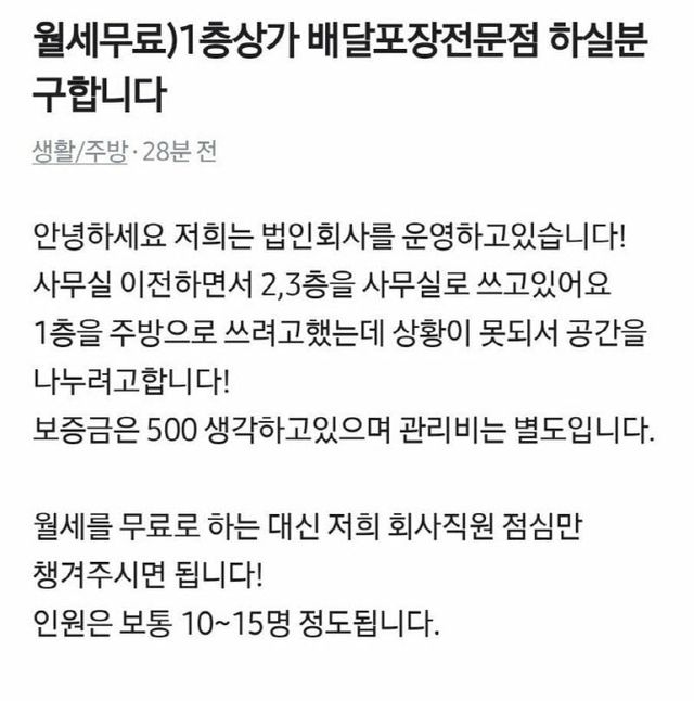이어 “보증금은 500만원으로 생각하고 있다”며 “관리비는 별도”라고 했다. 다만 A씨는 “월세를 무료로 하는 대신 우리 회사 직원 점심만 챙겨주시면 된다”며 “인원은 보통 10~15명 정도 된다”고 조건을 덧붙였다.