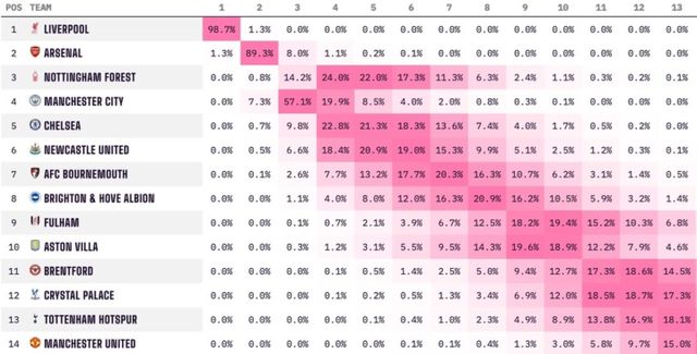 리버풀 팬들이 환호할만한 소식이다. 반대로 다른 구단 팬들은 절망적인 소식이다. 먼저 2위 아스널의 이번 시즌 리그 우승확률은 1.3%다. 그 밑에 노팅엄(3위), 맨시티(4위) 등 다른 팀은 0%다. 리버풀은 대관식만 남겨뒀다고 해도 과언이 아니다.