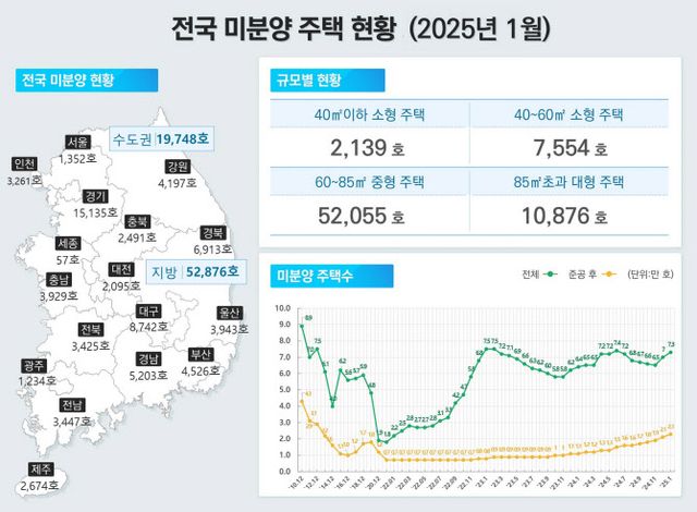 전국의 미분양 주택은 총 7만 2624가구로 전월(7만 173호) 대비 3.5% 증가했다. 전국 미분양 주택은 지난해 6월 총 7만 4037가구로 정점을 찍고 5개월 연속 감소하다 다시 증가하는 추세다. 수도권을 제외한 지방 미분양 물량은 5만 2876가구로 전국 미분양 물량의 72.8%가 지방에 쏠려있다.
