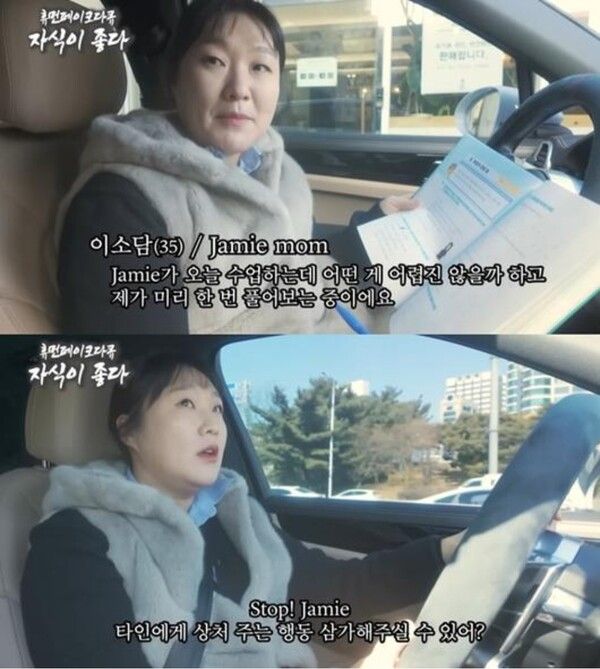 수업 전 자녀의 교재를 미리 풀어보는 모습도 담겼다. 이수지는 "제이미가 오늘 수업하는데 어떤 게 어렵진 않을까 하고 내가 미리 한 번 풀어보는 중이다"라며 차 안에서 문제집을 푼다. 이른바 '엄마표 공부'를 연기한 것이다.
