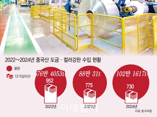 중국산 비중은 점차 증가하는 추세다. 중국산 건축용 도금·컬러강판 수입 물량은 최근 3년간 연 76만t에서 연 102만t까지 34.2% 증가했으며 단가는 t당 952달러에서 730달러로 23.3% 낮아졌다. 국산 제품 대비 약 10~15% 저렴한 수준이다. 최근에는 국산 제품과 t당 100달러 이상까지 차이가 벌어졌다.