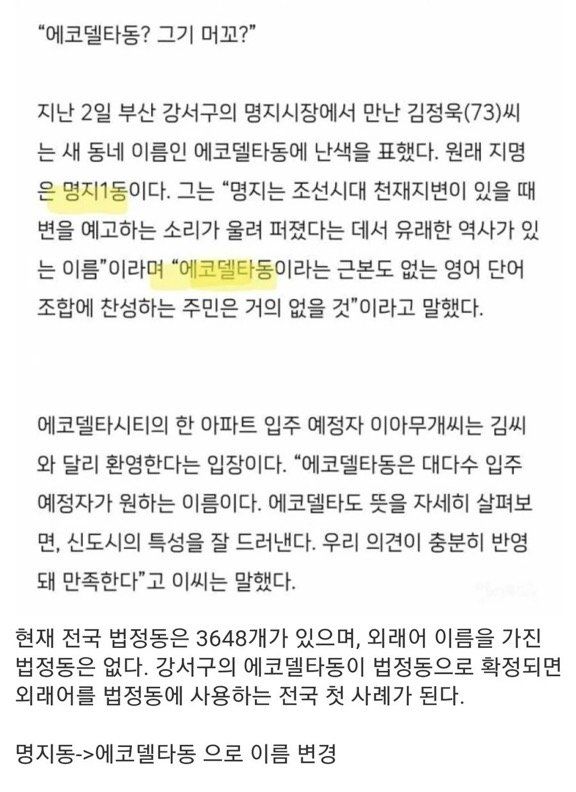 강서구의 에코델타동이 법정동으로 확정되면 외래어를 법정동에 사용하는 전국 첫 사례가 된다고 함