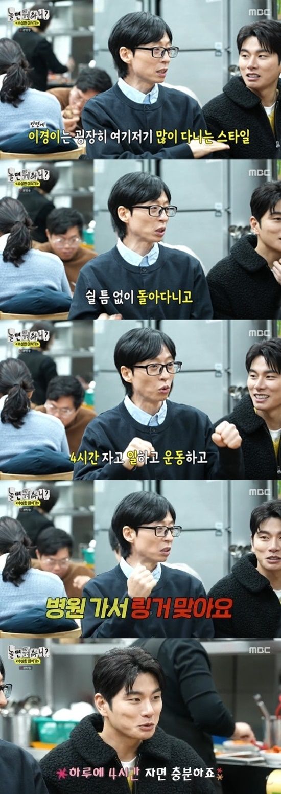 이이경은 "하루에 4시간만 자면 충분하다"고 말했고, 유재석은 "4시간 자고 일하고 운동하고 다음날 코피 쏟는다"라고 폭로하며 거듭 걱정의 목소리를 전했다.