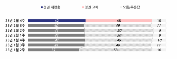 차기 대선에서 정권이 교체되어야 한다는 응답은 48%였고, 정권을 재창출해야 한다는 42%로 나타났다.