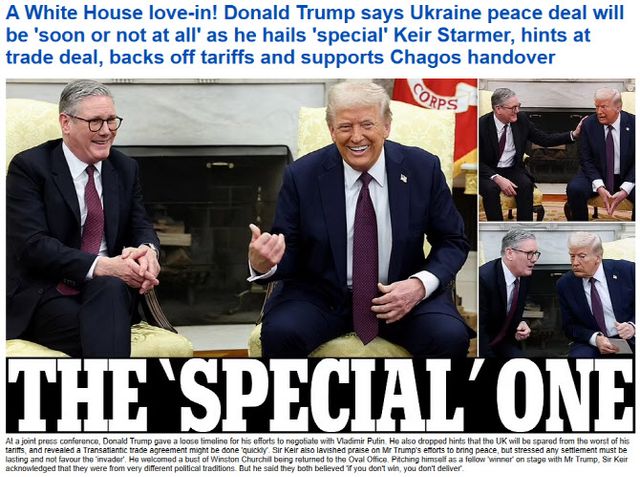 데일리메일은 27일(현지시간) 미국 워싱턴DC 백악관에서 열린 도널드 트럼프 대통령과 키어 스타머 총리의 회담에 대해 이같이 표현했다. 데일리메일은 우파 성향의 영국 대중 신문으로 영국 보수당에 우호적이며 브렉시트를 강하게 지지한 대표적 신문 중 하나이다. 그런 일간지조차 이번 트럼프 대통령과 스타머 총리의 회담은 호평하지 않을 수 없었던 것이다. 데일리메일은 “트럼프 대통령이 ‘특별한’ 스타머를 칭찬하고 관세가 없는 무역협정을 암시하며 차고스 이양에 대한 지지를 표시했다”고 밝혔다.