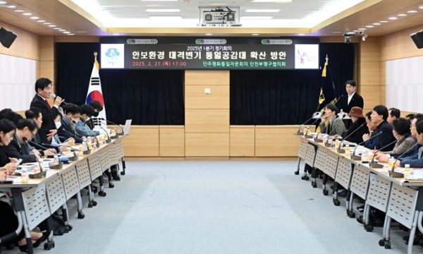 [한국미디어뉴스통신 박말희 기자] 민주평화통일자문회의 인천부평구협의회는 2월 27일 오후 5시, 부평구청 회의실에서 자문위원들과 대행기관장 차준택 구청장, 관계 공무원 등 35명이 참석한 가운데 ‘안보환경 대격변기 통일공감대 확산방안’을 주제로 2025년 1분기 정기회의를 개최했다.