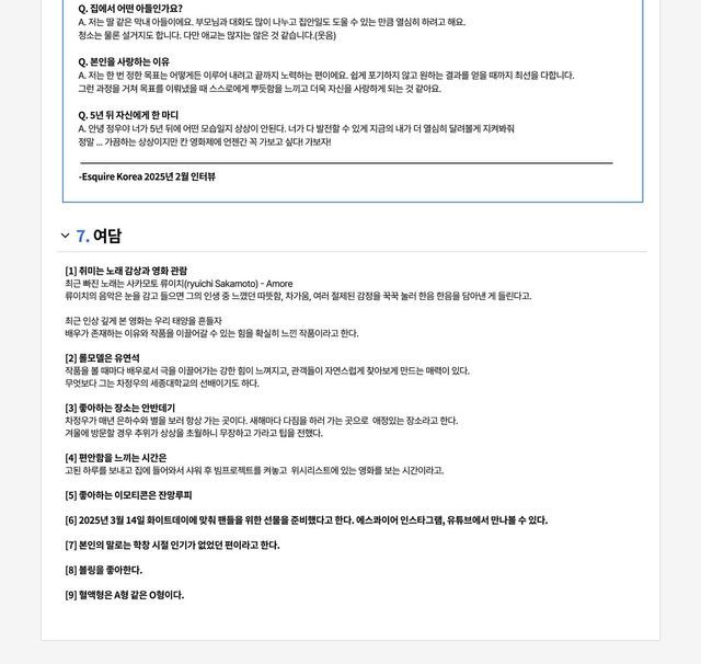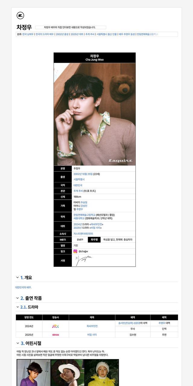 차정우 배우와 함께 적은 에스콰이어 자체 제작 〈차정우의 나무위키〉입니다. 다채로운 매력을 가진 차정우 배우의 TMI를 살펴보세요.