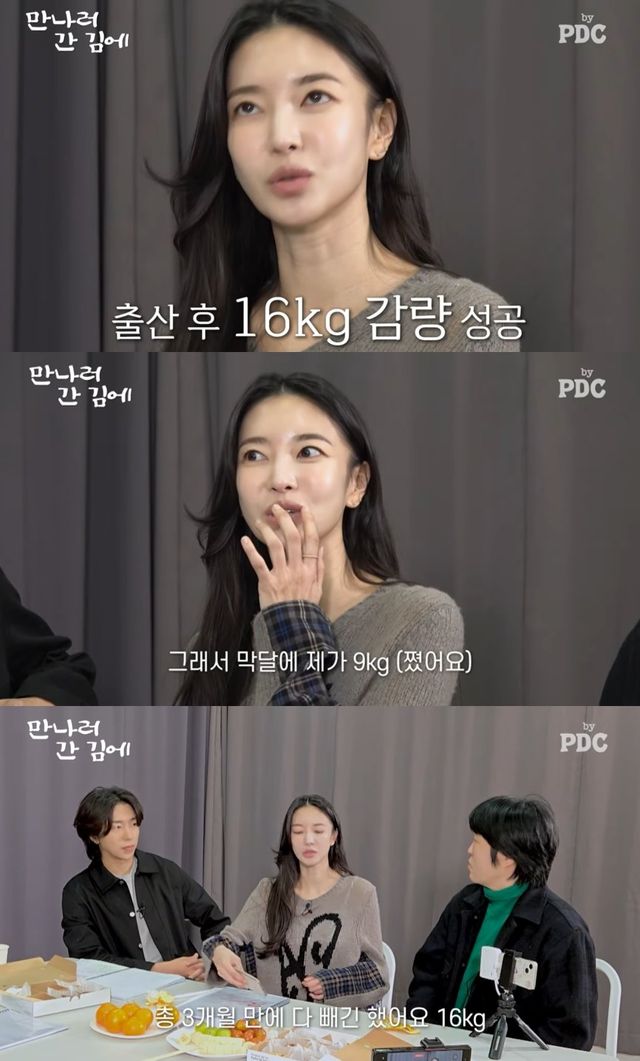 그는 "임신 8개월까지는 스케줄이 있어서 정말 잘 유지를 하다가 막달에 이제 일을 쉬면서 먹고 싶은 거 다 먹은 거다. 막달에 9kg이 쪘다"면서도 "총 3개월 만에 16kg을 다 감량했다"고 말해 모두를 놀라게 했다. 그는 조리원에서 10kg을, 나머지 6kg는 조리원 퇴소 이후 두 달간 감량했다고 설명했다.