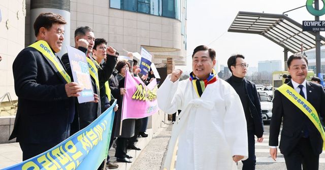 2036 하계올림픽 국내 후보 도시 선정일인 28일 서울 올림픽파크텔에서 김관영 도지사를 비롯한 전북특별자치도 체육회, 재경향우회 회원들이 대의원총회에 참석하는 위원들에게 전북 유치의 염원을 담아 응원전을 펼치고 있다. / 뉴스1