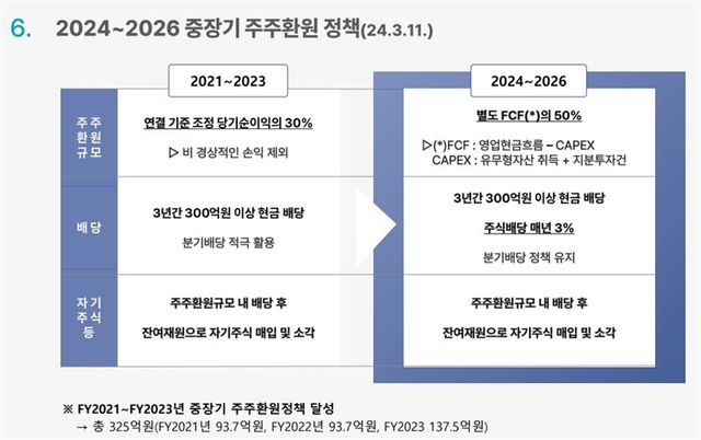 기존(2021~2023년) 주주환원정책에서는 연결 기준 조정 당기순이익의 30%를 주주환원 재원으로 활용했다.
