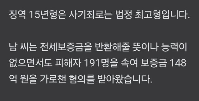 191명에게 148억 보증금 뜯고 한푼도 안돌려줌 청년 피해자4명 자살 -> 징역 15년 최고형 선고