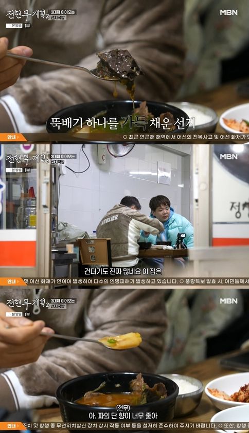 전현무는 "매운 거 못 먹는 너도 먹을 수 있을 정도로 많이 맵지 않다"며, "파의 단 향이 너무 좋다"고 계속 들이켰다.
