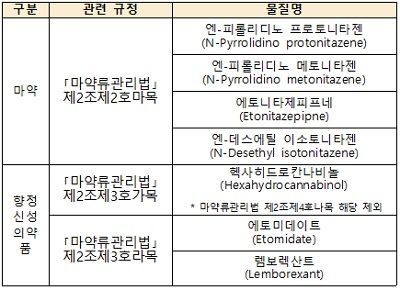 이번에 마약류로 신규 지정하는 물질은 제68차 유엔(UN) 마약위원회(CND, Commission on Narcotic Drugs: 국제 마약 통제협약 이행 감독 등 역할 수행)에서 마약 또는 향정신성의약품으로 지정할 예정 물질 5종(마약 : 엔-피롤리디노 프로토니타젠 등 4종, 향정신성의약품 헥사히드로칸나비놀)과 국내 마약류안전관리심의위원회에서 마약류 지정을 결정한 에토미데이트 등 향정신성의약품 2종(에토미데이트, 렘보렉산트)이다.