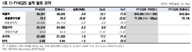 강재구 한화투자증권 연구원은 “이번 실적 발표를 통해 인공지능(AI) 인프라 투자 위축, 딥시크와 ASIC 등으로 인한 엔비디아 제품 판매 부진 등 시장참여자들의 걱정이 완화됐을 것”이라고 분석했다.