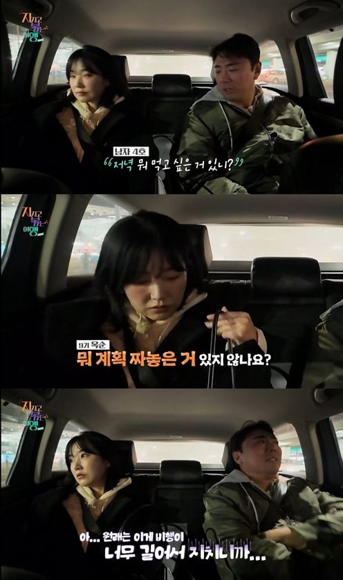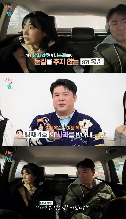 “총무 잘 보시냐?”는 남자 4호의 말에 갑자기 ‘여행 총무’가 된 9기 옥순은 택시를 잡은 뒤 먼저 ‘쌩’ 가버렸다. 남자 4호는 부랴부랴 뒤를 쫓았고, 택시에 올라탄 남자 4호는 “저녁에 뭐 먹고 싶은 거 있니?”라고 물었다.