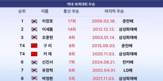 이번 우승으로 역대 세계대회 우승 8회를 기록하며 커제와 동률 달성.