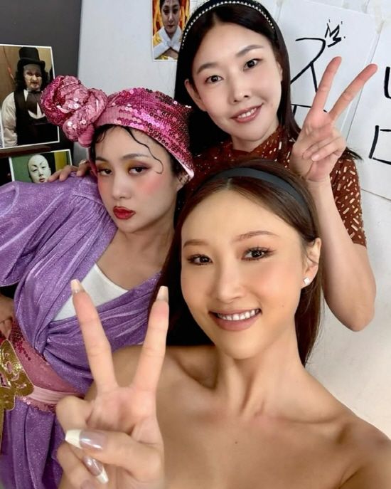 사진은 박나래의 유튜브 채널 '나래식' 촬영 현장에서 찍은 것으로, 박나래, 한혜진, 화사는 찐친 모먼트를 한껏 발산했다.