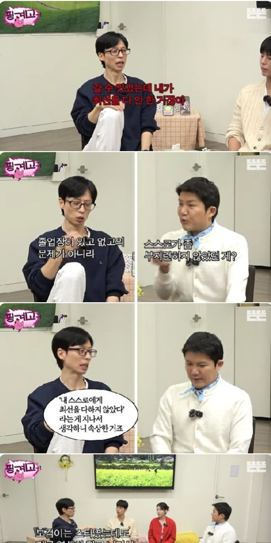 유재석은 "물론 이제 내 하고 싶은 일을 하고 있고 그래서 이런 선택을 한 거지만 생각해 보면 20대에 후회하는 게 그거다. 솔직히 말하면 학교에 갈 수 있었는데 최선을 다 안 한 거지 않냐. 최선을 다하지 않는 게 속상하다. 졸업장이 있고 없고의 문제가 아니라 나 스스로에게 최선을 다하지 않았다는 게 지나서 생각하니 속상한 거다. 보검이는 스타인데도 열심히 학교 나가서 다 하지 않았냐"라고 설명했다.