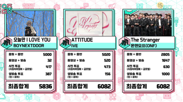 1일 방송된 MBC ‘쇼! 음악중심’(이하 ‘음중’)에서는 보이넥스트도어 ‘오늘만 아이 러브 유’(오늘만 I LOVE YOU), 아이브의 ‘애티튜드’, 온앤오프 ‘더 스트레인저’(The Stranger)가 1위를 놓고 경쟁했다.