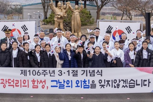 기념식은 ‘1919년 광덕리의 함성, 그날의 외침을 잇다’를 주제로 △국민의례 △독립선언서 낭독 △기념사 △기념공연 △3·1절 노래 합창 △만세삼창 순으로 엄숙하면서도 감동적으로 이어졌다.