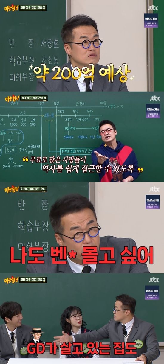 최태성은 "으리으리한 지드래곤이 살고 있는 집도 살 수 있다. 장훈이 빌딩도 양재동에 있지 않나"라며 폭주해 모두를 폭소케 했다.