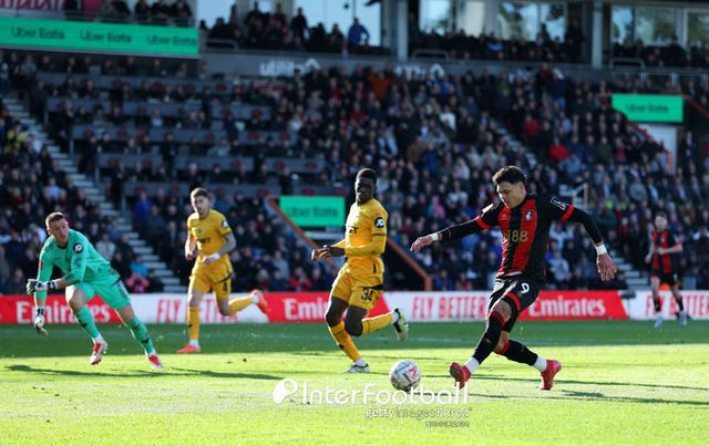 본머스가 결실을 맺었다. 전반 30분 뒤쪽에서 롱패스가 날아왔고 세메뇨가 우측 하프 스페이스에서 볼을 잡았다. 세메뇨의 슈팅이 골키퍼 맞고 나왔고 이를 에바닐손이 마무리했다. 본머스가 1-0으로 앞서갔다.