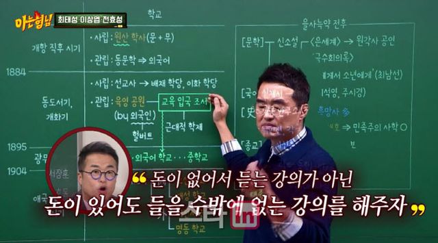 그럼에도 계속해서 마음을 다잡고 지낸다는 최태성은 “수능 사교육 시장이 엄청난데 한국사능력검정시험계에는 사교육 시장이 존재 않는다. 내가 모든 강의를 무료로 제공하기 때문에 일타 강사가 나타나지 않는 것”이라고 말했다.