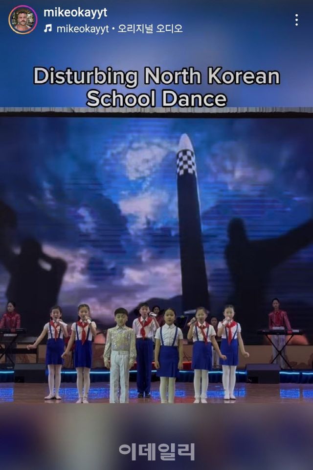 그가 공개한 공연 영상에는 빨간 넥타이를 맨 아이들이 노래를 부르는 아이들이 노래를 부르는 가운데 뒤편의 스크린에서 폭발 장면이 재생되는 모습이 담겨있다.