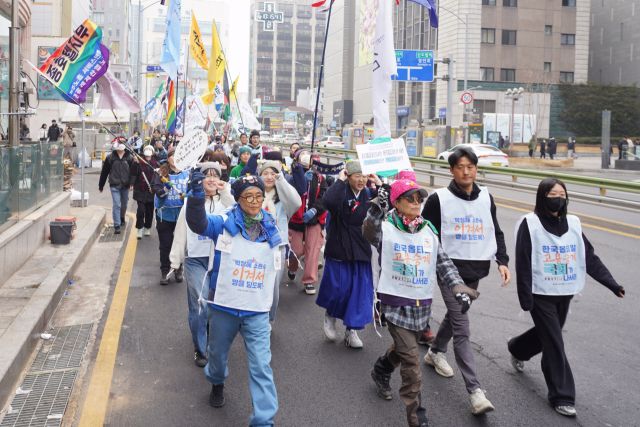 다시 40여분 간 2.5킬로미터 떨어진 광화문광장으로 행진이 계속됐다. 중구 한화오션 본사 앞을 지날 때는 처우 개선을 요구하며 천막농성 중인 조선하청 노동자들이 "연대투쟁호"라고 적힌 배 모양의 바퀴 달린 조형물을 끌고 합류했다. 광화문에 다 와 갈 때쯤에는 "빨갱이"라고 호통을 치는 사람, 태극기와 성조기가 붙은 깃대로 행진 대열에 세워진 깃발들을 툭툭 치는 사람이 나타났다. 희망뚜벅이 참가자들은 대응을 자제하며 꾸준히 앞으로 나아갔다.