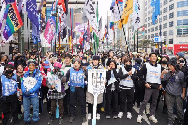 애초 이날 행진은 국회에서 끝날 예정이었지만, 지난달 17일 고 지부장이 세종호텔 정리해고 노동자 6명의 복직을 요구하며 고공농성에 돌입함에 따라 명동 세종호텔을 거치는 것으로 행진 경로가 바뀌었다. 최근 정국 등을 고려해 마무리 장소는 명동에서 멀지 않은 광화문광장으로 결정됐다. (☞관련기사 : 25년 차 일식 요리사가 세종호텔 앞 10m 고공에 오른 이유)