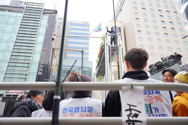 때로는 씩씩하게, 때로는 담담하게 보이는 표정으로 걷던 이들은 서울 명동 세종호텔이 보일 때쯤 눈시울을 붉히기 시작했다. 그들의 눈이 가 닿는 곳에는 세종호텔에서 정리해고된 나머지 노동자 6명의 복직을 요구하며 호텔 앞 10미터 높이 도로시설 구조물에 올라 17일째 농성 중이던 고진수 세종호텔지부장이 우뚝 서 있었다.