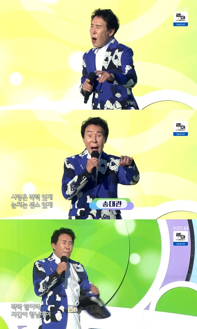 송대관은 파란색 재킷에 커다란 화이트 꽃무늬가 장식된 의상을 입고 무대를 누볐다. 맛깔진 창법과 특유의 무대매너로 현장에 모인 관객들을 사로잡았다.
