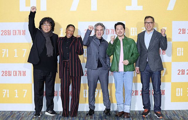 봉준호 감독(왼쪽부터)과 배우 나오미 애키, 마크 러팔로, 스티븐 연, 최두호 프로듀서가 지난 달 20일 서울 강남구 코엑스 메가박스에서 열린 영화 '미키17'(감독 봉준호) 내한 기자간담회에 참석해 포즈를 취하고 있다. '미키17'은 위험한 일에 투입되는 소모품(익스펜더블)으로, 죽으면 다시 프린트되는 ‘미키’(로버트 패틴슨 분)가 17번째 죽음의 위기를 겪던 중, 그가 죽은 줄 알고 '미키 18'이 프린트되면서 벌어지는 예측불허의 이야기를 그린 작품이다 / 뉴스1