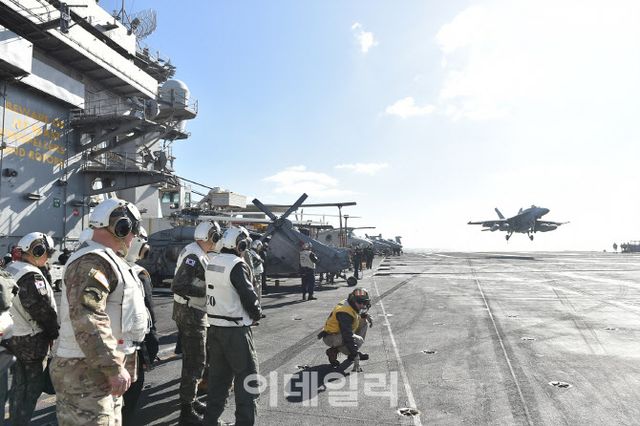 2023년 11월 미 해군 최초로 5세대 스텔스 전투기 F-35C를 탑재하고 방한한 칼빈슨함은 제주 남방 공해상에서 한미일 해상 연합훈련을 했다. 지난 해 1월에도 한반도에 전개해 한미일 해상훈련을 실시했다.
