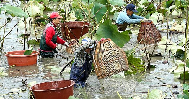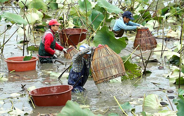 2016년 10월 1일 전남 강진군 작천면 용동저수지에서 마을주민들과 관광객들이 가래로 붕어와 가물치를 잡고 있다 / 뉴스1(강진군 제공)