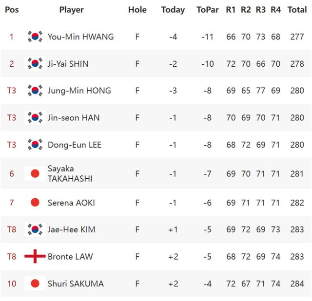 다카하시 사야카, 아오키 세레나(이상 일본)가 각각 6위와 7위에 오른 가운데, 김재희도 5언더파 283타로 공동 8위에 이름을 올렸다.