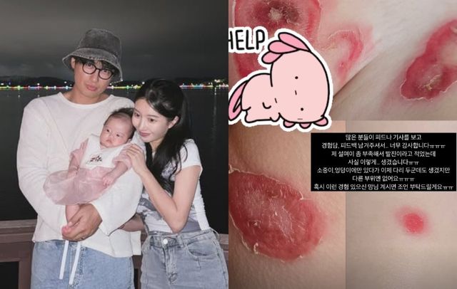 그런 가운데 2일 오후 아야네는 "제 설명이 좀 부족해서 발진이라고 적었는데 사실 이렇게 생겼습니다"며 딸의 피부 상태를 공개했다. 붉은 발진이 피부 곳곳에 생긴 모습.