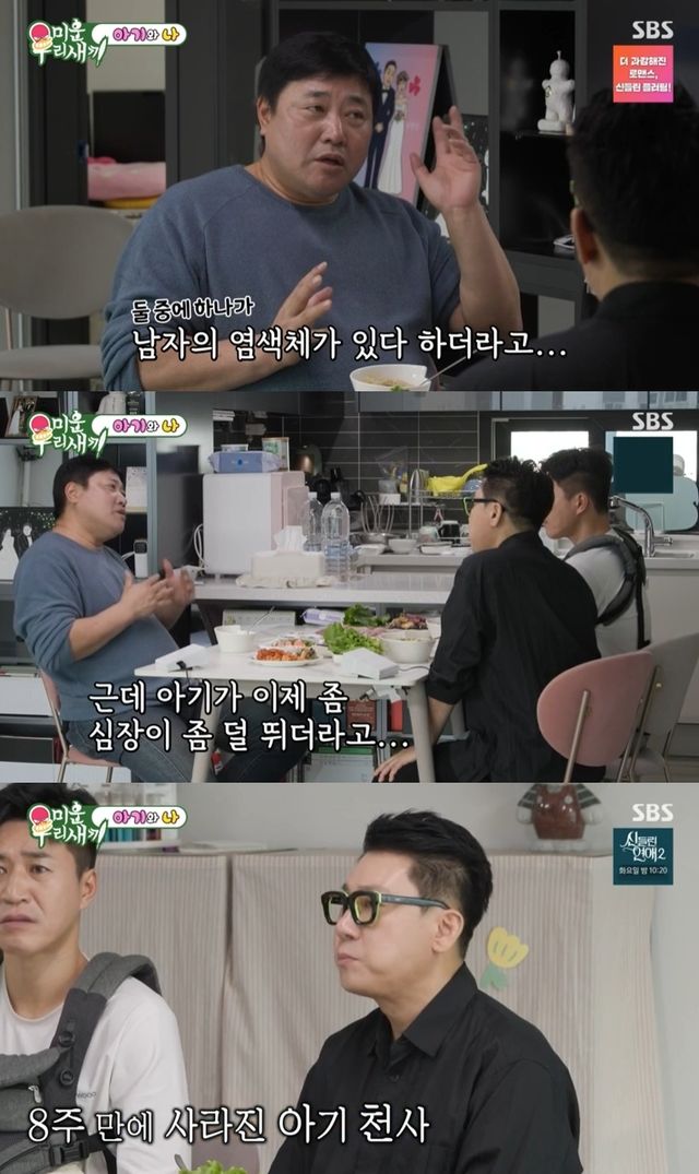 이어 "아기가 심장이 덜 뛰더라. 8주 됐을 때 떠났다. 하나라도 잘 키우자고 생각했다"며 아내의 유산 사실을 털어놨다. 양준혁의 사연에 김종민은 아이를 향해 "너 참 귀하다"며 격려했다.