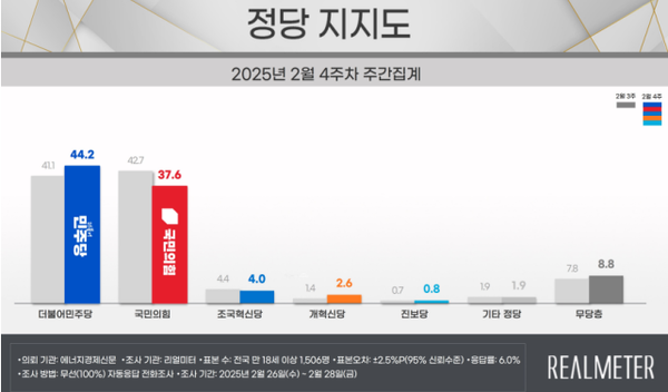여론조사업체 리얼미터가 에너지경제신문 의뢰로 지난달 26~28일(2월4주차) 이틀간 전국 18세 이상 유권자 1006명을 대상으로 한 정당 지지도 조사에 따르면 국민의힘은 37.6%, 민주당은 44.2%로 집계됐다.